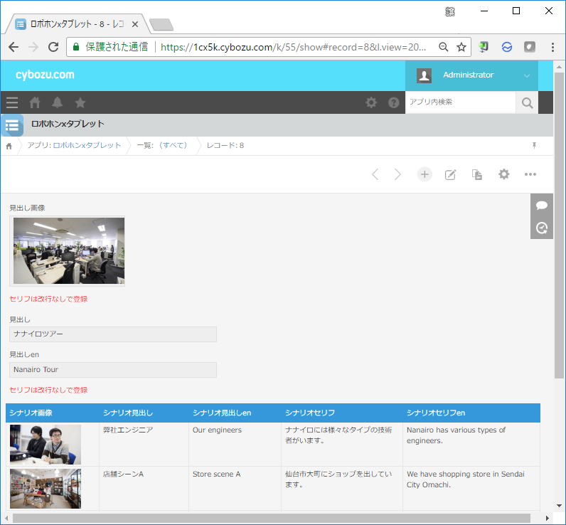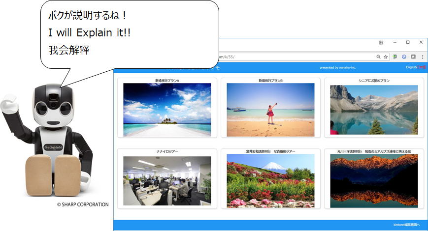 kintoneと連携し、タブレット、スマホ、PCに画像を表示させながらロボホンが説明を行うソリューションです。